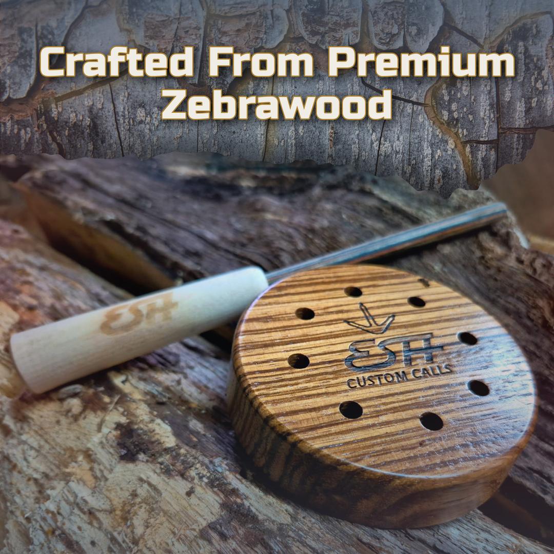 This call is a solid zebrawood pot with a glass surface. Zebrawood is a favorite choice by Pat that can perform on stage as well as in the turkey woods. This is a call that can do it all, producing a wide range of tones and is capable of hitting loud raspy tones as well as soft clucks.